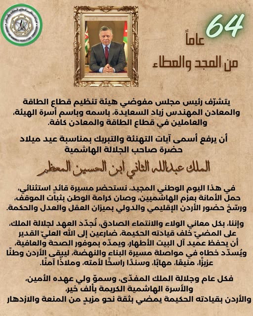 السعايدة يهنىء بعيد ميلاد صاحب الجلالة الملك عبدالله الثاني بن الحسين